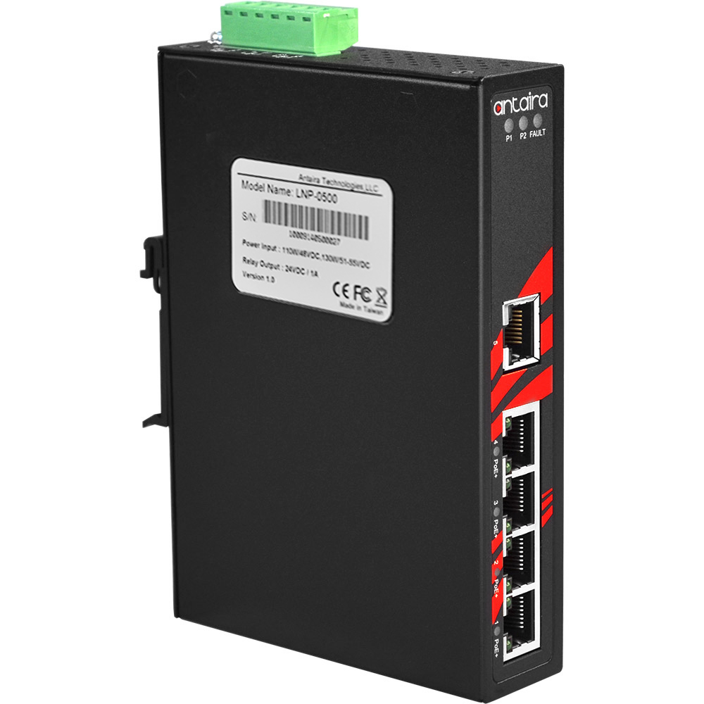 Antaira’s LNP-0500 is a smart 5-port Industrial Unmanaged Ethernet Switch supporting IEEE-802.3at compliance (Power-over-Ethernet Plus) on ports 1 to 4. The switch is classified as power sourcing equipment (PSE), and when used in this way, LNP-0500 enables centralization of the power supply and provides up to 30 watts of power per port. LNP-0500 can be used to power IEEE 802.3af or 802.3at compliant power devices (PD), eliminating the need for additional wiring, and support IEEE 802.3/802.3u/802.3x with 10/100BTx, full or half duplex, MDI/MDI-X auto sensing to provide an economical solution for the Industrial Ethernet Network. In addition, the Network Broadcast Storm Protection and built-in relay warning function alerts network engineers when power failures or port breaks occur.